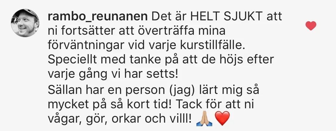 "TUSEN TACK Nicklas Karlsson för en helt grym utbildning 🙏⭐❤! Ditt sätt att leda, lära ut och skapa stort engagemang är fantastiskt, dessutom är du väldigt rolig och bjuder på dig själv vilket kryddar hela utbildningen😍! Det "enkla" verktyget du lär ut om tankar har redan hjälpt mig och gett mig många insikter som jag kommer ha enorm hjälp av genom livets toppar och dalar⭐❤🙏! Tack också till alla er fantastiska människor som deltog i utbildningen, det var otroligt kul och lärorikt att få "glutta" in i era liv💖! Jag kan varmt rekommendera Nicklas, alla borde gå denna utbildning, då skulle världen bli mycket bättre ⭐⭐⭐!"